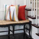 Add a modern touch to any room with this geometric design in crewel embroidery. On-trend shades of yellow, black, green, gray and orange are embroidered atop an off-white ground. Each pillow has slight variances for a magnificent one-of-a-kind style you're sure to love. Additional features of this throw pillow include a coordinating solid back, a knife edge seam for a clean finish and a recycled polyester fiber fill insert with a zipper closure.