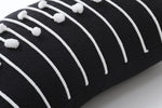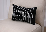 Make a modernistic impression with this abstract, decorative lumbar pillow. Appliqued on a textured black ground, twisted white cording runs vertically across the pillow creating three-dimensional pom poms that add visual interest in the center of this throw pillow. Simplistic and unique. Additional features of this lumbar pillow include a knife edge seam for a clean finish and recycled polyester fiber fill with a sewn seam closure.