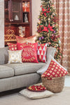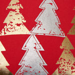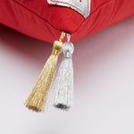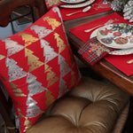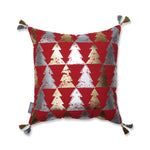 This decorative Christmas throw pillow combines gold and silver distressing against a Christmas red ground to create a rich look for your holiday home. The printed and appliqued festive trees flaunt distressing that portrays a crackle look and modern feel. Each corner sports double Lurex tassels: one silver and one gold. Additional features include a knife edge seam for clean finish, recycled polyester fiber fill and a sewn seam closure.