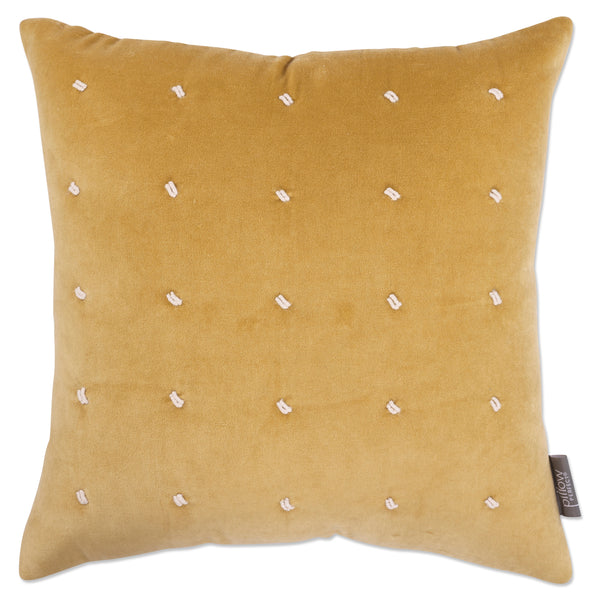 The Pillow Perfect Throw Pillow in French Knots Yellow is crafted from a cotton plush velvet and accented by French knots. The luxe feel of the velvet combined with the handmade knots give the pillow a polished feel that would be exceptional on your living room sofa or armchair. - the pillow can easily be paired with prints or complementary solids. The plush recycled polyester fill will maintain the pillow's shape for years to come. Dry clean only as needed.