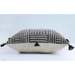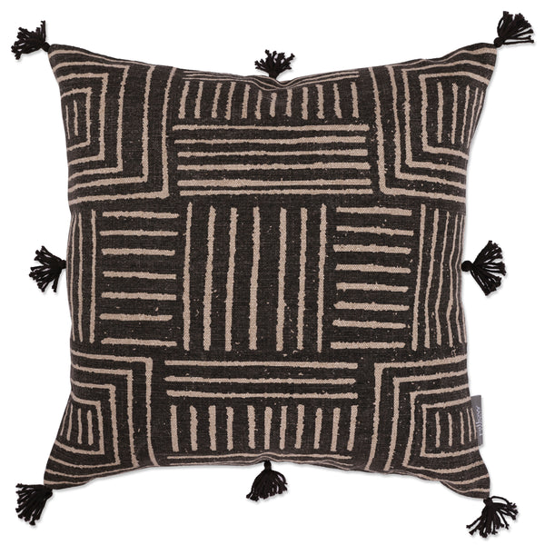 The Pillow Perfect Throw Pillow in Abstract Blocks Black is a modern block print design that has been stone washed to create a slightly softer, worn-in feel. Colored in black and natural, the simple timely method of stone washing yields artistic results with unique charm and character. Chunky yarn tassels upgrade this pillow for a clean and mod look. - the pillow can easily be paired with prints or complementary solids. The plush recycled polyester fill insert will maintain the pillow's shape for years to come. Hand wash only as needed and hang to dry.