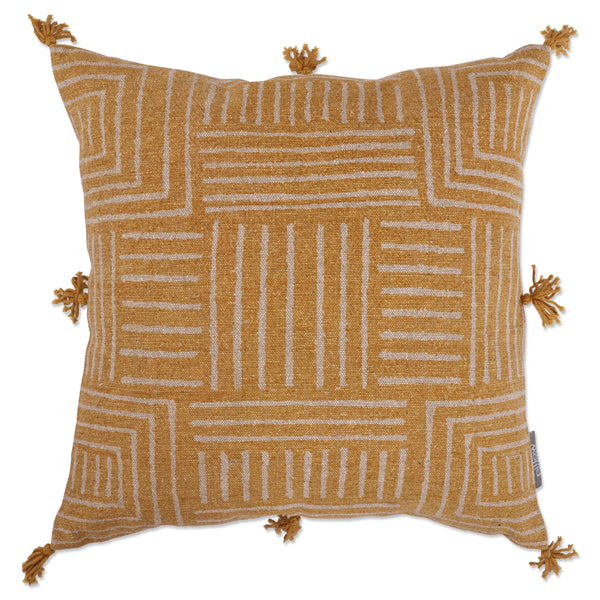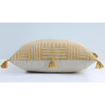 The Pillow Perfect Throw Pillow in Abstract Blocks Yellow is a modern block print design that has been stone washed to create a slightly softer, worn-in feel. Colored in yellow and natural, the simple timely method of stone washing yields artistic results with unique charm and character. Chunky yarn tassels upgrade this pillow for a clean and mod look. - the pillow can easily be paired with prints or complementary solids. The plush recycled polyester fill insert will maintain the pillow's shape for years to come. Hand wash only as needed and hang to dry.