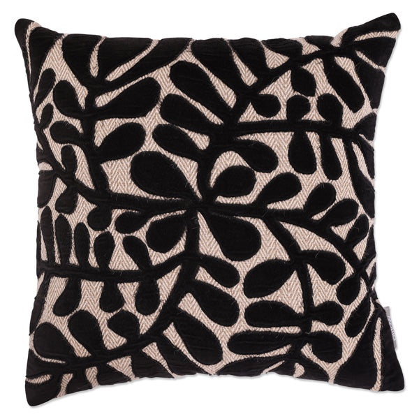 The Pillow Perfect Throw Pillow in Falling Leaves Black is eye-catching and chic. This standout pattern features a seamless black velvet floral design Appliqued on a natural herringbone ground. Pair with solid black pillows and cushions to keep the look monochromatic or mix with other prints for a look that really pops. The plush recycled polyester fill insert will maintain the pillow's shape for years to come. Spot clean or hand wash only as needed.