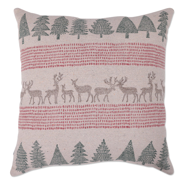 Christmas decorations don't always have to be red, green, and glittery. The Pillow Perfect Christmas/Holiday Throw Pillow in Woodland Forest Natural features a group of reindeer grazing in between rows of wintry evergreens. Hand block-printed in red and dark green with driftwood brown wildlife on natural cotton dhurrie, this pillow would be right at home with your holiday decor. The plush recycled polyester fill insert will maintain the pillow's shape for years to come. Spot clean or hand wash only as needed.