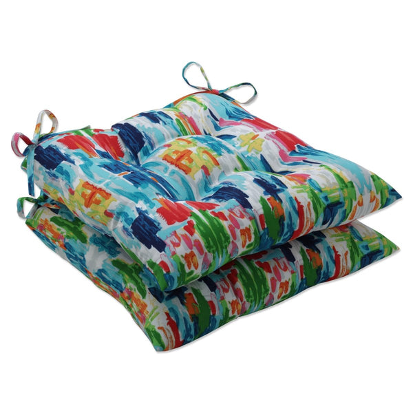 Embrace color with this set of two outdoor tufted chair cushions. Their fresh and vibrant kaleidoscopic print will give your poolside or deck a magnificent new look. Bright shades of red, pink, yellow, green and blue stream across a white ground to deliver an abstract painterly touch. Additional features of these outdoor tufted chair cushions include 14" ties and recycled polyester fiber fill with sewn seam closures. Also suitable for indoor use.