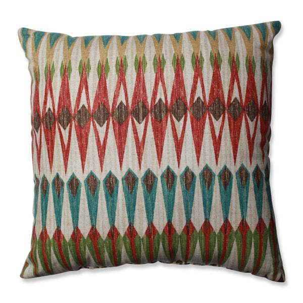 This artsy throw pillow with a Midwestern design brings to mind long summers and bright classic shades. Natural colored linen-look fabric is covered in varying rows of contrasting arrows in shades of dark red, teal, green, and brown. Easily accent any room or coordinate this pattern with pillows in complementary shades for a new look with a relaxed feel. Additional features of this throw pillow include a knife edge seam for a clean finish and recycled polyester fiber fill with a sewn seam closure.