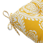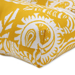 Festively elegant and bright, this outdoor bench cushion makes the perfect accent for bringing life to your patio or porch. Crisp paisley patterns in off-white are set against an attractive shade of yellow on fade-resistant fabric. Includes tufted detailing, 14" ties and recycled polyester fiber fill with a sewn seam closure. Suitable for indoor use.