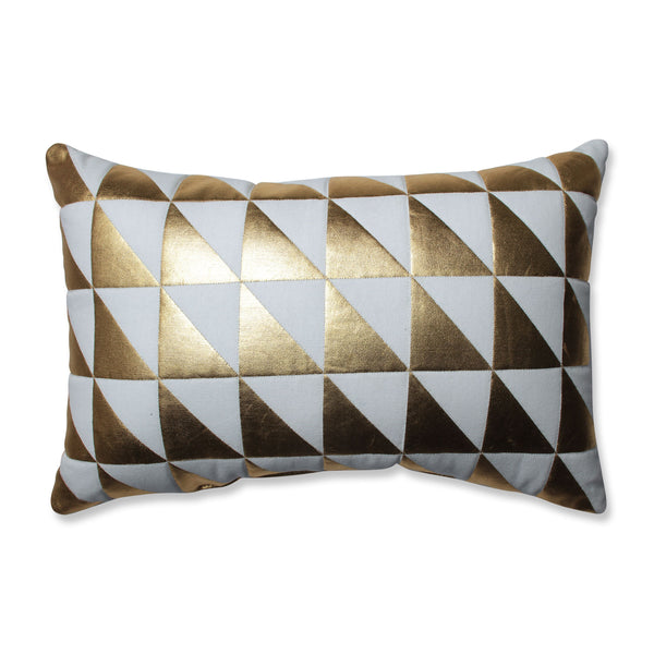 See your rooms in gorgeous holiday style with the modern quilted design of white fabric and metallic gold triangles. This lumbar pillow adds bright style, holiday sparkle and glamour to your living area with its bold, geometric design. Feel free to use it year-round for added glitz in your home. Additional features of this lumbar pillow include a knife edge seam for a clean finish and recycled polyester fiber fill with a sewn seam closure.