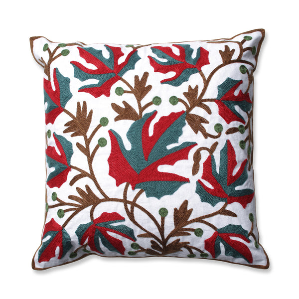 Accent any room in your home with the beautiful leaves of this throw pillow. Set on an off-white ground, embroidered leaves pop in shades of red and gray, along with brown stems and green berries. Additional features of this throw pillow include a knife edge seam for a clean finish and a recycled polyester fiber filled insert with a zipper closure.