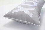 • Single-sided pillow cover: "XOXO" design includes appliqued and embroidered white letters set on a gray ground