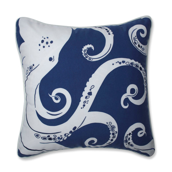 Get pulled into the intrigue of the Ollie the Octopus throw pillow and enjoy stylish twists in your indoor or outdoor oasis. Decorated in blue embroidery, this sprawling octopus resting on the pillow's front pulls off a stunning look. His off-white shape is set against a solid ground in a shade of blue for a dramatic effect. The coordinating pillow back is an ottoman weave with a pronounced ribbed texture. UV protected, made of 100% durable polyester. Additional features of this outdoor throw pillow include a coordinating off-white welt cord for a beautiful finish and recycled polyester fiber fill with a sewn seam closure. Also suitable for indoor use.
