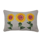 Replicating the vibrant flower head and thick stem of a sunflower, this Thanksgiving pillow gives a bold greeting to autumn's colorful foliage. Embroidered in shades of berry, yellow and green, the set of striking sunflowers burst off the crosshatch woven fabric adding slubby texture and a rustic feel. Additional features of this lumbar pillow include a coordinating welt cord, recycled polyester fiber filled pillow insert, and a zippered closure.