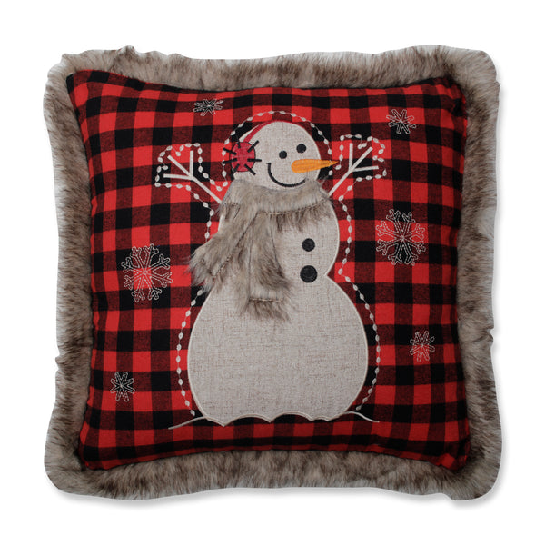 Add a touch of farmhouse style to your holiday decor with this Christmas throw pillow featuring an appliqued and embroidered snowman atop a classic red & black mini buffalo check. This pillow is accented with a soft and lush faux fur trim to complete the look. Additional features include a buffalo check back, pillow insert containing recycled polyester fiber fill, and a zippered closure.