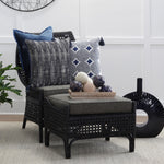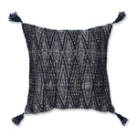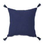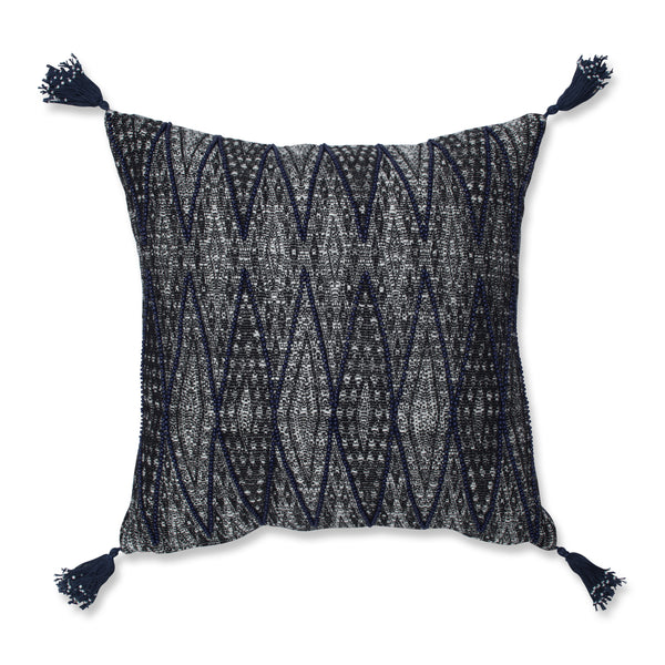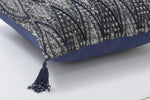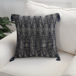 Inspired by global influences, this decorative pillow is full of rich textures and artful detail. The intricate navy blue beadwork creates bold geometric shapes atop a dramatic black and off-white woven, textured ground. Corner tassels with pearlized beading complete the look. Additional features include a knife edge seam for a clean finish, a coordinating solid color blue back and recycled polyester fiber fill insert with a zipper closure. 100% cotton fabric.