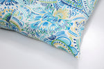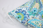 The captivating beauty of this set of two outdoor tufted chair cushions delivers elegance. Their artful pattern of paisley and floral design is in painterly style with shades of blue, green and yellow on an off-white linen textured ground. Additional features of these outdoor tufted chair cushions include 14" ties and recycled polyester fiber fill with sewn seam closures. Also suitable for indoor use.