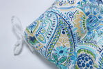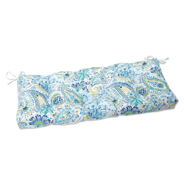 The captivating beauty of this artful patterned outdoor bench cushion's fabric delivers elegance. Its paisley and floral design is in painterly style with shades of blue, green and yellow on an off-white linen textured ground. Includes tufted detailing, 14" ties and recycled polyester fiber fill with a sewn seam closure. Suitable for indoor use.