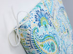 The captivating beauty of this artful patterned outdoor oversized chaise lounge cushion's fabric delivers elegance. Its paisley and floral design is in painterly style with shades of blue, green and yellow on an off-white linen textured ground. Additional features of this outdoor oversized chaise lounge cushion include 14" ties to secure the cushion to your furniture, square corners and recycled polyester fill with a sewn seam closure.