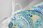 The captivating beauty of this set of two outdoor seat cushions delivers elegance. Their artful pattern of paisley and floral design is in painterly style with shades of blue, green and yellow on an off-white linen textured ground. Additional features of these outdoor seat cushions include rounded corners, 14" ties and recycled polyester fill with sewn seam closures. Also suitable for indoor use.