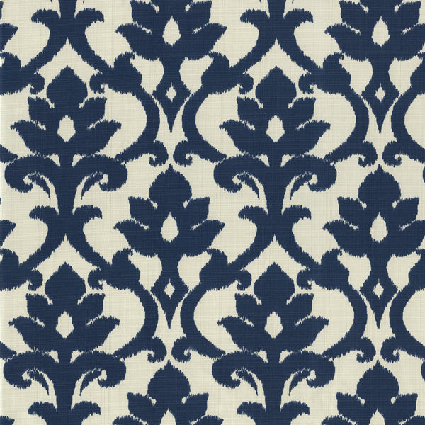 This bold damask features nautical navy and crisp white with an artistic ikat touch to the design. See this pattern in a nautical themed room, paired with light furniture for an airy feeling to your decor.