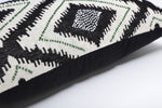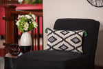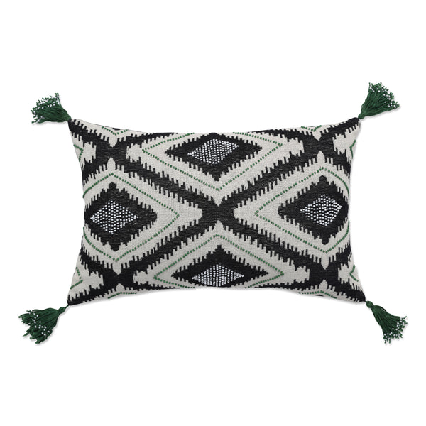 Inspired by global traditions, the geometric abstract pattern of this rectangular pillow is perfect for adding a modern touch to any room. Embellished with elaborate green and pearlized beading, you'll be captivated by the energetic dark blue pattern of bold diamond-like shapes on a natural ground. Green corner tassels with pearlized beading complete the look. Flip the pillow over to a coordinating cotton back in a shade of green. Additional features of this lumbar pillow include a knife edge seam for a clean finish and a recycled polyester fiber fill insert with a zipper closure.