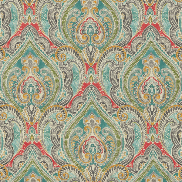 This bold and beautiful paisley outdoor fabric creates a sophisticated and worldly look. Rich hues of coral, turquoise, green, yellow, and gray infuse this large scale UV and weather resistant outdoor print emphasizing every detail.