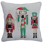 A handsome choice for the holidays, these classic nutcrackers are standing guard in their dapper uniforms on this Christmas throw pillow. Intricately detailed, three glimmering nutcrackers are embroidered in shades of red and green with metallic gold and silver accents atop a lux off-white velvet ground. It's hard to resist their charm as these nutcrackers will be a real standout this season. Additional features include a coordinating metallic silver welt cord, a pillow insert containing recycled polyester fiber fill, and a zipper closure.