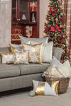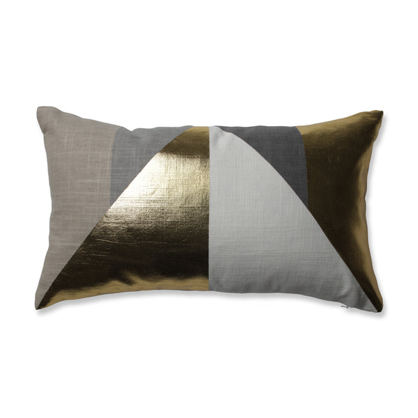 Give a room show-stopping style with this geometric lumbar pillow with shimmering triangles made from luxe metallic gold, charcoal gray and neutral taupe. These interlocking shapes draw the eye, while the rustically textured base cloth adds unique slubs to the fabric that show through every color of the design. This plush rectangular throw pillow makes a perfect accent to gold or Christmas decor as it picks up the light in your room and shimmers with beauty. Additional features include a knife edge seam for a clean finish, a feather & down insert and a zipper closure.