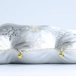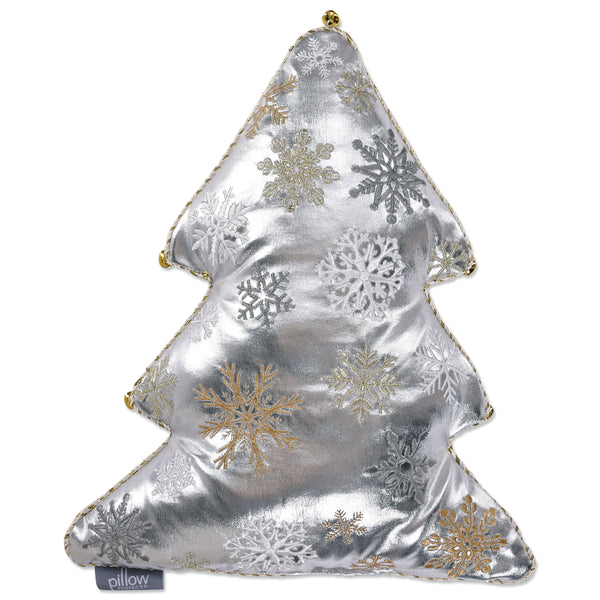 Whether you rock around the Christmas tree or sit next to it sipping hot cocoa, the Pillow Perfect Metallic Christmas Tree Indoor Throw Pillow will make an eye-catching addition to your seasonal decor. This metallic silver tree-shaped pillow features various sizes of embroidered snowflakes in shimmering gold and silver thread, as well as delicate gold jingle bells along the tree's edges. Perfect for any entry bench, sitting area, or an overstuffed armchair, this fun Christmas pillow is finished with white and gold welt cord along its seams. The recycled polyester fill is plush and keeps the pillow's shape so you can enjoy it year after year. Spot clean as needed using mild detergent.
