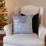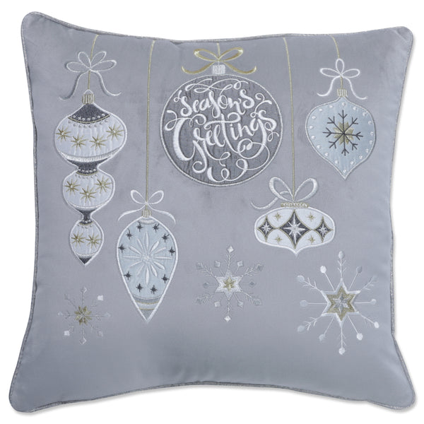 Make a mesmerizing addition to your holiday decor with this Christmas Ornaments throw pillow. Appliqued and embroidered with incredible attention to detail, the dazzling ornaments are colored in neutral hues of gray, gold, and off-white with metallic accents atop a gray lux velvet ground. The center silver ornament delivers a Christmas greeting. Embroidered ribbons, strings, and snowflakes embellish the design. Additional features include a coordinating metallic silver welt cord, a pillow insert containing recycled polyester fiber fill, and a zipper closure.