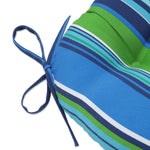 This set of two outdoor tufted chair pads features an unbalanced stripe printed in bright shades of blue, green and white. They will make a striking statement in any outdoor space. Additional features of these outdoor tufted chair pads include 14" ties to secure the cushions to your furniture and recycled polyester fiber fill with sewn seam closures. Also suitable for indoor use in kitchen and dining areas.