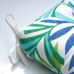 Large abstract tropical foliage in bright shades of blue, green and turquoise pops from an off-white ground with this outdoor bench cushion. The pattern is printed on outdoor fade-resistant polyester fabric that has a slub texture for added dimension. Additional features of this outdoor bench cushion include tufted detailing, 14-inch ties and recycled polyester fiber fill with a sewn seam closure. Also suitable for indoor use.