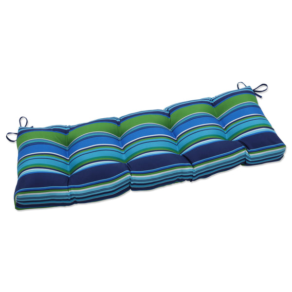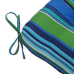 This outdoor bench cushion features an unbalanced stripe printed in bright shades of blue, green and white. It will make a striking statement in any outdoor space. Additional features of this outdoor bench cushion include tufted detailing, 14" ties and recycled polyester fiber fill with a sewn seam closure. Also suitable for indoor use.
