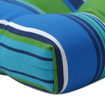 This set of two outdoor tufted wicker chair cushions features an unbalanced stripe printed in bright shades of blue, green and white. They will make a striking statement in any outdoor space. Additional features of these outdoor tufted wicker chair cushions include recycled polyester fiber fill and sewn seam closures. Also suitable for indoor use.
