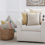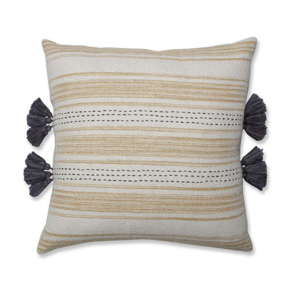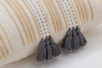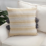 Simply irresistible, this one-of-a-kind decorative pillow is constructed of a handloomed, horizonal stripe woven in subtle shades of yellow and natural. Warm gray accents draw your eye to the pillow's center where two hand-embroidered rows of "kantha" stitches end with 12 commingled tassels to add embellishment and dimension. Additional features include a knife edge seam for a clean finish and a recycled polyester fiber fill insert with a zippered closure. Made of 100% cotton.