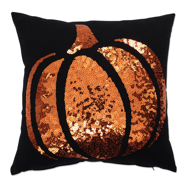 | A classic icon fall icon. This beautifully crafted throw pillow features an embroidered pumpkin design. Crafted in glittering orange metallic sequins over a black background. This one will delight all of your autumn, Halloween, and Thanksgiving needs. |