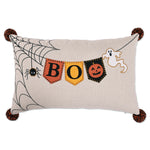 Boo-tifully designed, this decorative Halloween rectangular throw pillow brings a tasteful touch to this haunting season. Ghoulishly adorned with embroidery and applique, the magical message revealed on the banner is a signature blend of ghostly style and quality materials. The textured, linen-like ground creates a sharp contrast to the oversized pom-poms in each corner adding to its seasonal ambiance. Additional features of this Boo Halloween lumbar pillow include a knife edge seam for a clean finish and recycled polyester fiber fill with a sewn seam closure.