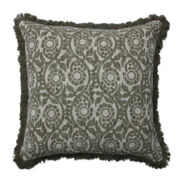 This 100% cotton hand-block print is created using an age-old Dabu mud-resist printing technique. As relevant today in its appeal as it was centuries ago, this decorative pillow is colored using pure vegetable dyes that give it its green hue. Completing the look is a 3/4" moss fringe, which adds dimensional interest. Additional features of this throw pillow include a cotton canvas back and a recycled polyester fiber fill insert with a zipper closure.