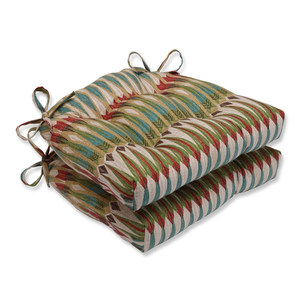 This artsy set of two tufted chair pads with a Midwestern design brings to mind long summers and bright classic shades. Natural colored linen-look fabric is covered in varying rows of contrasting arrows in shades of dark red, teal, green and brown. Easily accent any room or coordinate this pattern with decor in complementary shades for a new look with a relaxed feel. Additional features of these tufted chair pads include 14-inch ties to secure the cushions to your furniture and recycled polyester fiber fill with sewn seam closures.