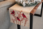 This Christmas table runner is perfect for your holiday tablescape. Printed with a French script, embroidered and appliqued, this 16x72-inch table runner features birds, branches, and berries. The cardinals are dressed in a festive Christmas plaid. Perfect for the holidays and all winter long.