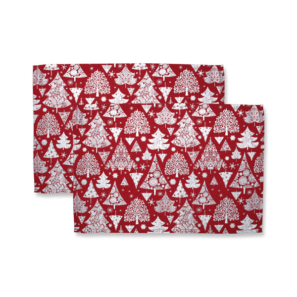It's beginning to look a lot like Christmas as this decorative placemat pair sets a jolly tone for your holiday home. Printed in a metallic silver ink, the iconic tree silhouettes quietly stand out from the textured, red ground creating subtle and sophisticated festive ambience. Additional features of these Christmas placemats include a generous size of 13" x 18" and a clean, double-needle edge.