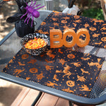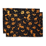 This frightfully fun Halloween placemat pair sets a marvelously eerie tone for visitors. Witches, cats, bats and jack-o-lanterns, OH MY! Printed with a metallic orange ink, the iconic Halloween silhouettes stand out from the spellbinding, black ground creating a simple & seasonal ambience. Additional features of these Halloween placemats include a generous size of 13" x 18" and a clean, double-needle edge.