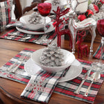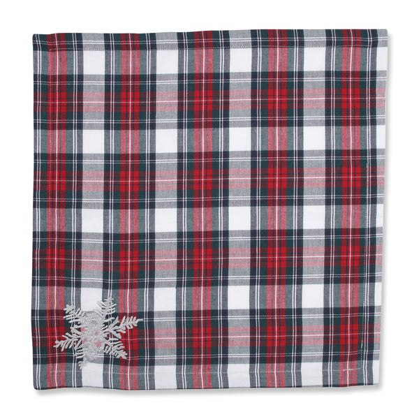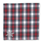 Classic snowy white fabric is woven with rich Christmas red, fir tree green, and glimmering silver Lurex threads. This charming design brings to mind family Christmases, days filled with playing in the snow, and cuddling together in front of the fire with a cup of cocoa. See this gorgeous pair of 18-inch Christmas cloth napkins bring together the look of your holiday decor for many years to come. You'll love how the delicate silver stitching shimmers in the lights from your Christmas tree. Pair these Christmas plaid napkins with the matching Stuart white placemats for a coordinated look.