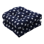 This set of two outdoor tufted wicker chair cushions features a navy blue ground with crisp, white stars. This classic, Americana print gives this pattern a casual feel for any outdoor decor. Additional features of these outdoor tufted wicker chair cushions include recycled polyester fiber fill and sewn seam closures. Also suitable for indoor use.