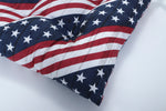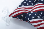 This set of two outdoor tufted chair cushions is accented with a distressed Americana diagonal striped pattern. The printed stars and stripes in patriotic colors of red, white and blue, give this pattern a casual feel for any outdoor decor. Additional features of these outdoor tufted chair cushions include 14" ties and recycled polyester fiber fill with sewn seam closures. Also suitable for indoor use.