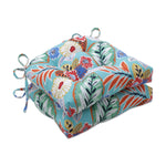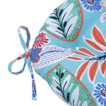 Lively and colorful, the updated floral pattern of this set of two outdoor tufted chair pads is perfect for brightening up any backyard oasis. Abstract flowers and leaves in shades of orange, yellow, blue and green contrast nicely against the aqua ground. Additional features of these outdoor tufted chair pads include 14" ties to secure the cushions to your furniture and recycled polyester fiber fill with sewn seam closures. Also suitable for indoor use in kitchen and dining areas.