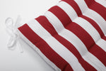 This set of two outdoor tufted chair cushions features a classic cabana stripe. Printed in red and white, the two-inch wide stripes give this pattern a casual feel for any outdoor decor. Additional features of these outdoor tufted chair cushions include 14" ties and recycled polyester fiber fill with sewn seam closures. Also suitable for indoor use.