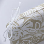 Oversized white leaves tell a monochromatic story on a natural ground with this set of two outdoor seat cushions. The pattern is printed on outdoor fade-resistant polyester fabric that has a slub texture for added dimension. Additional features of these outdoor seat cushions include round corners, 14-inch ties and recycled polyester fill with sewn seam closures. Also suitable for indoor use.