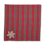Rich Christmas reds, fir tree greens, and shimmering gold Lurex threads give your home the feel of a traditional holiday season with this pair of charming 18-inch Christmas table napkins. Classic plaid gives your rooms old world charm, while the glimmering embroidered snowflakes sparkle across the surface like glistening snow. This stunning pair of red plaid napkins will add holiday charm and heartwarming style to your Christmas dinners for years to come! Pair this with the Stuart red placemats for a coordinated look.