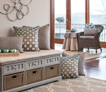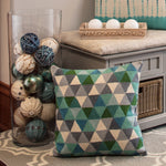 Give your space a modern, geometric look with this stunning ombre triangle design in coordinating shades of a stormy sea. From kelly green to pale teal and slate gray to creamy off-white, the pattern's colors tumble across the fabric in heavy embroidery, giving the design a sense of movement that will draw the eye. This pattern easily pairs with light or dark decor and provides a bright, new feel. The pillow's back is in neutral fabric that matches its front base cloth. Additional features of this throw pillow include a knife edge seam for a clean finish, a polyester fiber filled pillow insert, and a zipper closure.