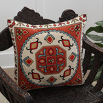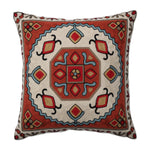 Create splendor in any living space with this decorative pillow. Its front is in crewel embroidery from edge to edge with a lively kilim design full of geometric motifs, ornamental detail and coordinated colors. In red, burnt orange, light blue and shades of tan and brown, elements found in the design are outlined in black, including the decorative border. The pillow has a cotton deck back in solid, natural color. Additional features include a knife edge seam for a beautiful finish and a recycled polyester fiber filled pillow insert with a zipper closure.